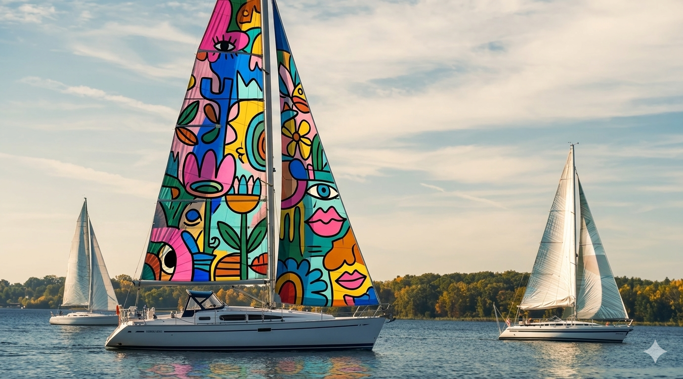 Explore the diverse richness of artistic expression unfolding across the sails, where each work captures a unique dialogue between movement, material, and imagination.