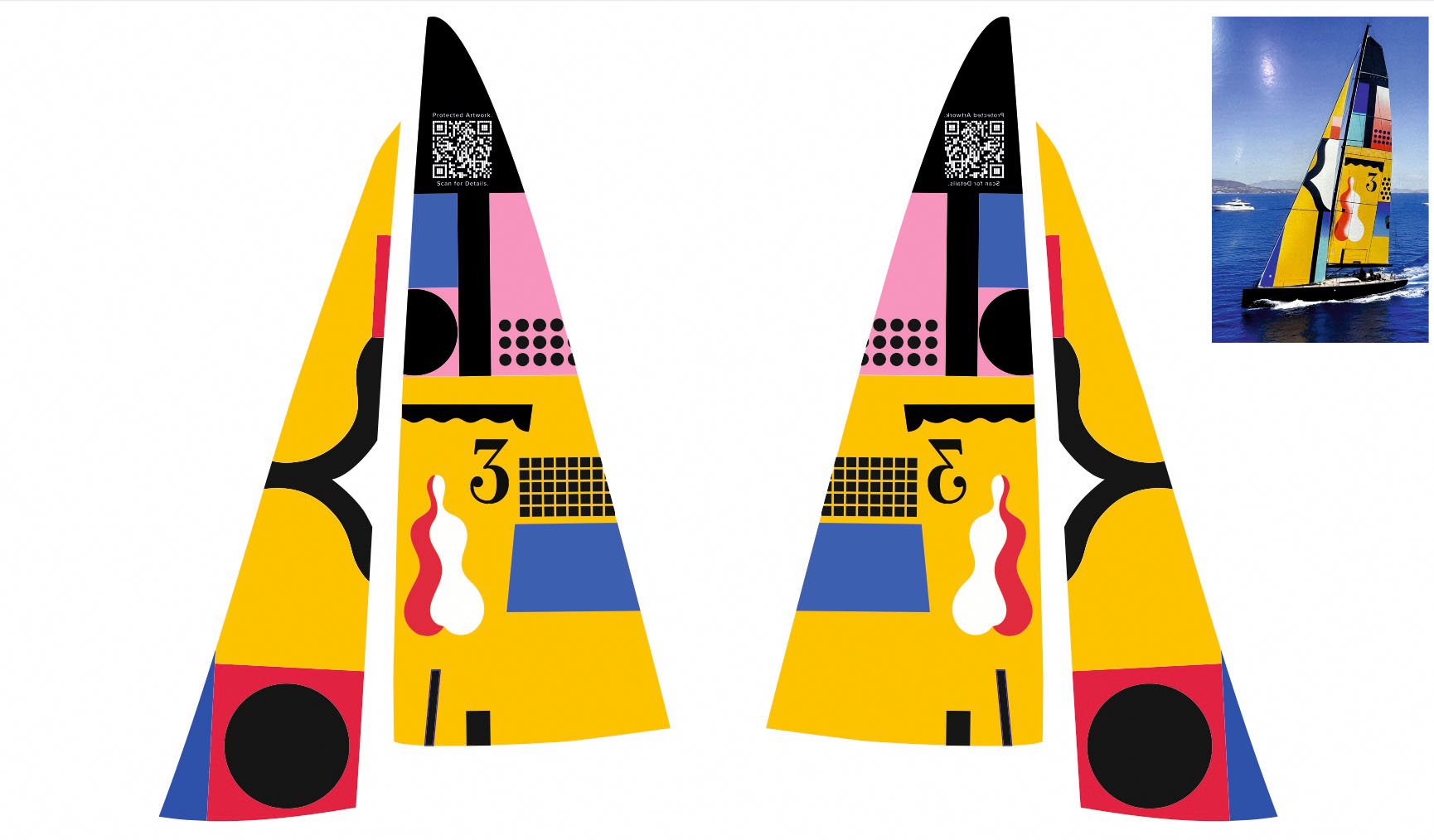 Frau mit Sonnenschirm extends Hans Ticha’s visual language into an unconventional support. The work unfolds across the sail as a shifting surface, where graphic clarity meets the instability of its environment. In this setting, the motif becomes both image and presence within the landscape.